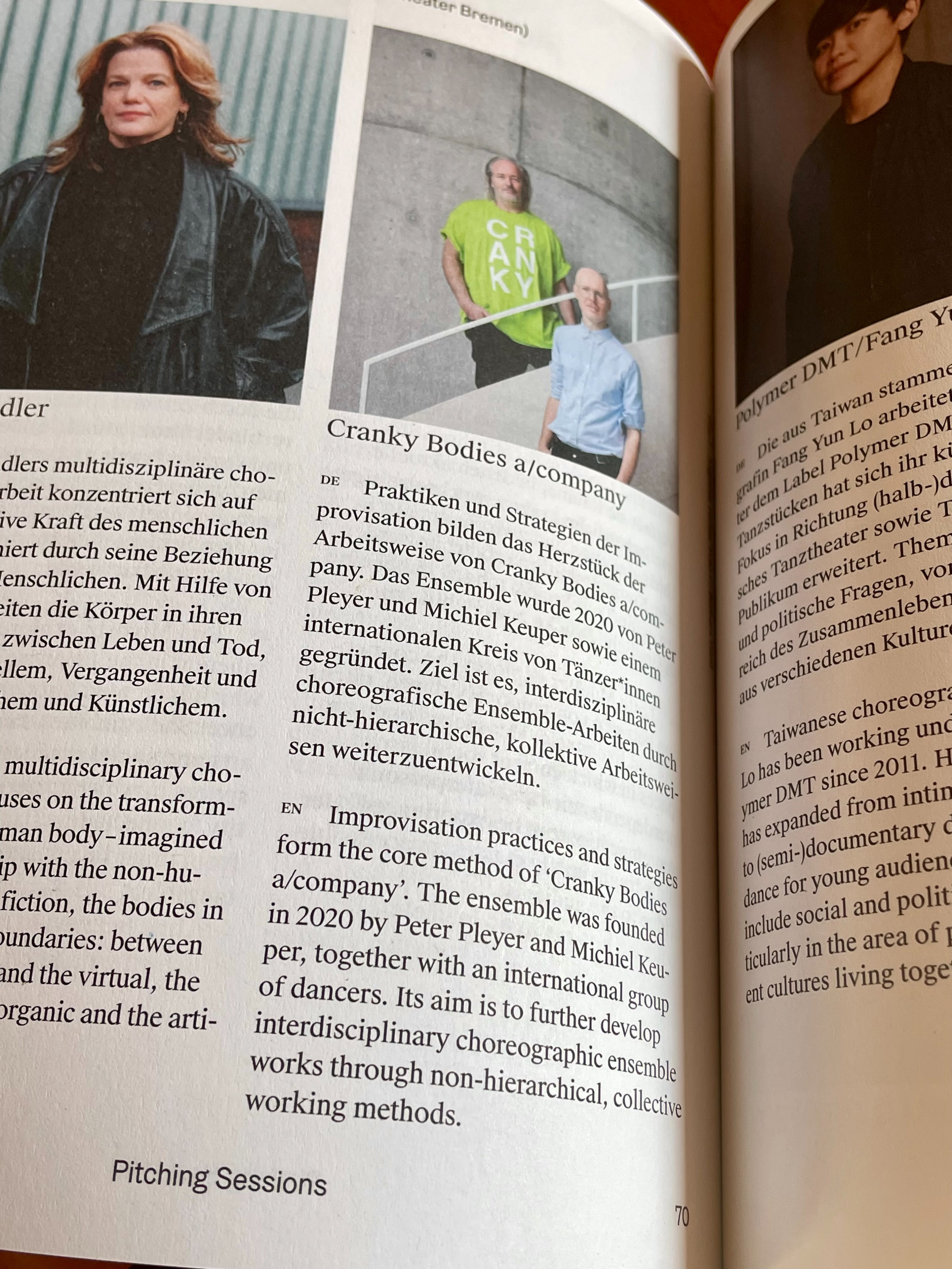 Cranky Bodies a/company wurde eingeladen, ihre Arbeit und zukünftigen Pläne bei der diesjährigen Tanzplattform Deutschland in Dresden zu präsentieren.